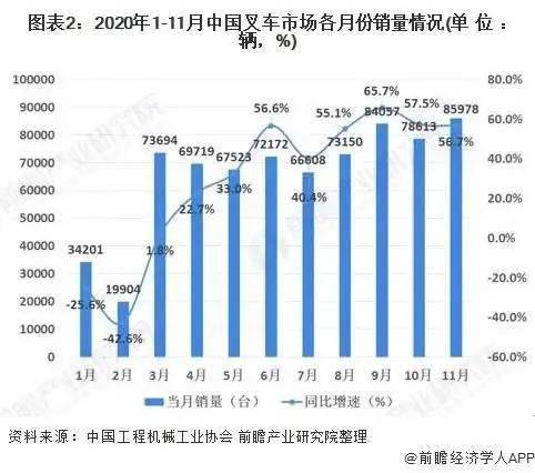 2020年受益于國(guó)內(nèi)新冠疫情得到迅速控制,國(guó)內(nèi)制造業(yè)、物流業(yè)的快速恢復(fù),叉車市場(chǎng)需求快速增長(zhǎng)。2020年1-11月份的累計(jì)銷量達(dá)到72.56萬(wàn)輛,與2019年同期相比增長(zhǎng)30.3%。